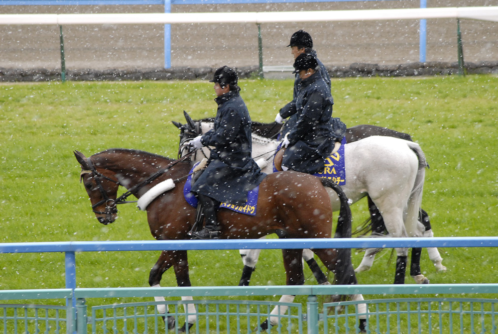2010/12/30 12月26日の最後の日曜日、有馬記念レースと重なって満員の中 昼頃のレースで急に雪が降り出しました。小倉3冠を取ったメイショウカイドウ号 も誘導馬としての仕事にも慣れたみたいで堂々としていました。